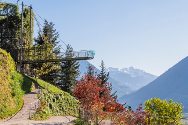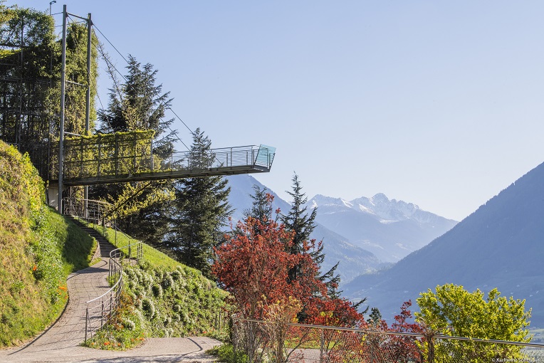 La spettacolare piattaforma panoramica, trasparente al 95%, nasce nel 2005 da un’idea dell’architetto e designer altoatesino Matteo Thun: salendo le scale, i visitatori hanno la sensazione di librarsi verso il cielo, per poi abbandonarsi, grazie a un binocolo tridimensionale, a una vista mozzafiato sulla Val d’Adige, sulla conca di Merano e sui rilievi circostanti.
