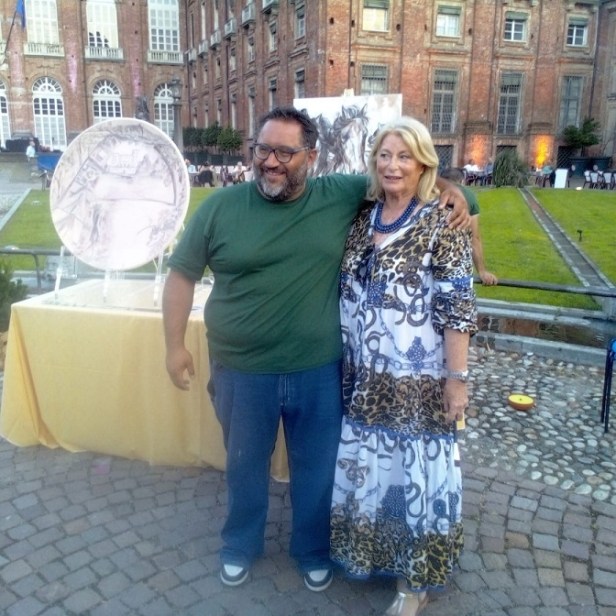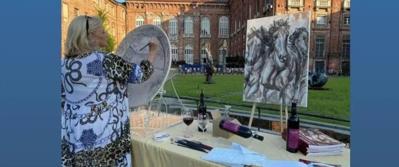 Ma in un vero firmamento di stelle il clou della manifestazione è stata l’artista fiorentina Elisabetta Rogai, che, con la sua EnoArte® ha incantato la platea, le autorità, le cantine, la stampa dipingendo live su una insolita tela d’artista rappresentata da una eccellenza del territorio, un piatto di ceramica de La Castellammonte di Roberto Perino e Silvana Neri, usando, al posto dei colori tradizionali, un vino del Consorzio dei Vini del Canavese.