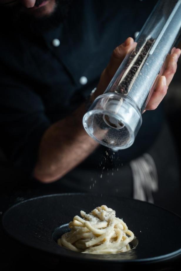 Imperdibili i suoi cavalli di battaglia: Tonnarelli Cacio e Pepe mantecati con pecorino romano DOP e pepe macinato grosso, e gli immancabili Spaghetti alla Carbonara.