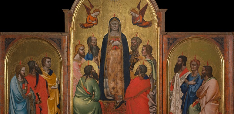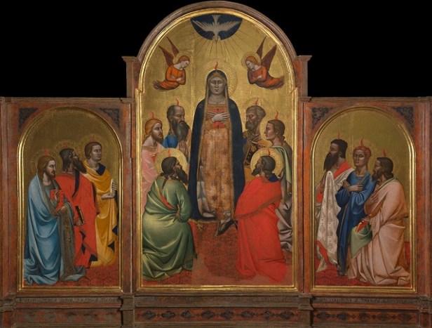 Muriel Vervat, nota restauratrice che collabora con importanti musei e con l’allora Soprintendenza Speciale per il Polo Museale di Firenze, ci farà scoprire i segreti della lavorazione di una tavola come quella dipinta, nel 1362-65, dal maestro fiorentino Andrea di Cione, che raffigura la Pentecoste, dove la Madonna inginocchiata è circondata dai dodici apostoli. La Vervat si sofferma in particolare sulla tecnica della foglia d’oro e della foglia d’argento, applicate su un fondo ad argilla di colore rosso;sulla realizzazione delle aureole, ognuna diversa dall’altra, con motivi floreali, che creano una pittura senza colore; sulle vesti dei Santi dove l’oro, in alcuni casi,è applicato sotto al colore, come nel san Jacopo sulla destra, il cui abito sembra avere una consistenza pesante, quasi fosse un velluto, arricchito da ricami, oppure della Vergine dove il metallo è apposto a pennello sopra con l’intento ben riuscito di conferirgli la leggerezza della seta.