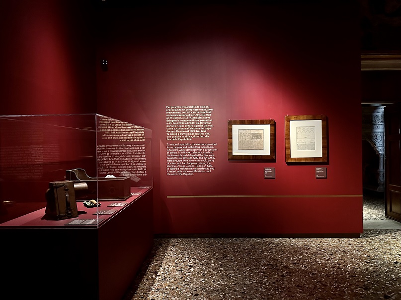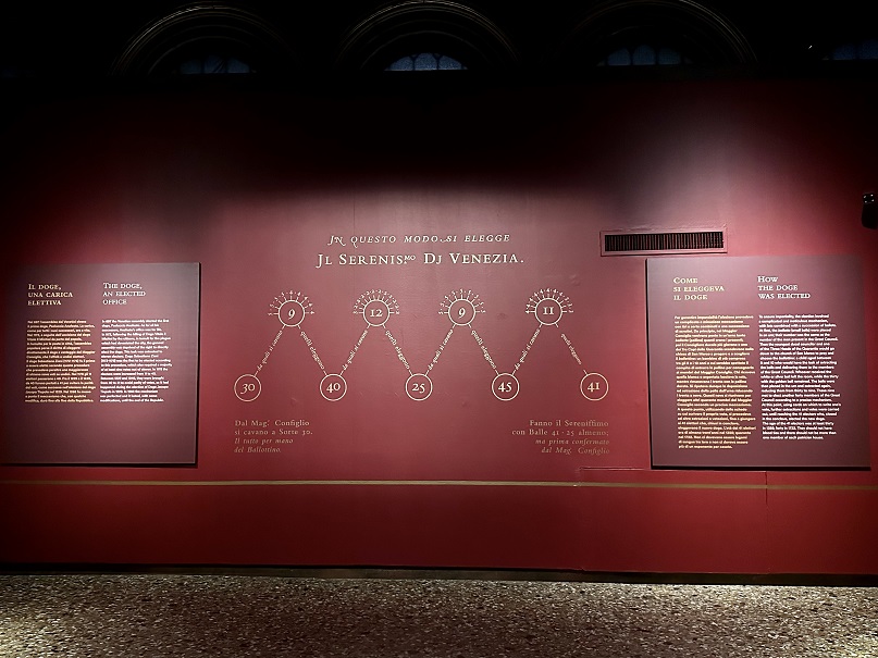 Il punto di partenza del percorso che è a disposizione dei visitatori, è l’elezione del doge: qui sono presentati gli strumenti, il metodo, i simboli dell’elezione a doge, cui si accompagnano alcuni aneddoti, come il più lungo conclave, e le tradizionali cerimonie di incoronazione.