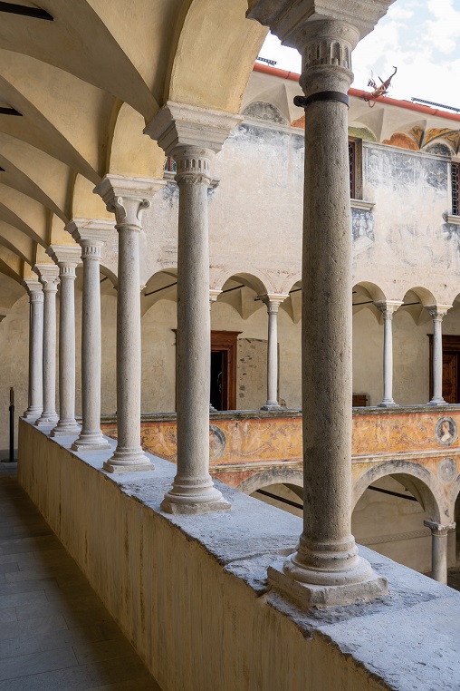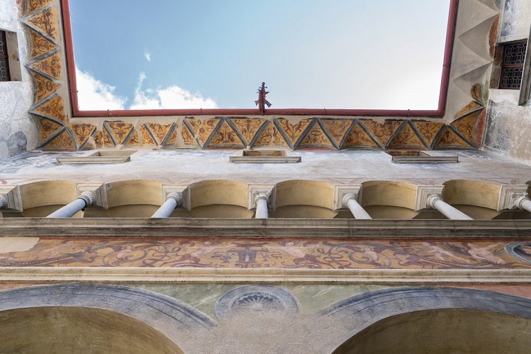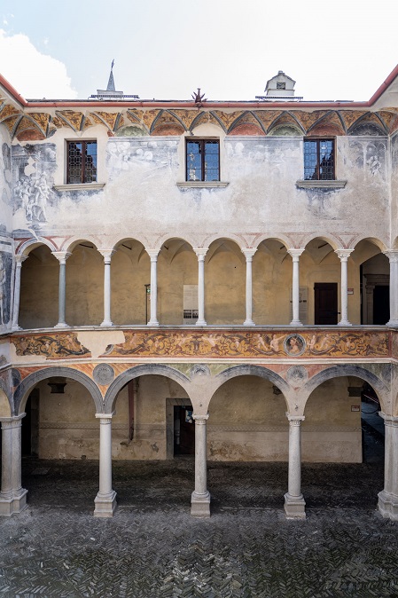 La corte d’onore di Palazzo Besta, di proporzioni perfettamente cubiche, è il fulcro intorno al quale si sviluppa – a tratti inglobando costruzioni di epoche precedenti – la dimora tellina, splendido esempio di palazzo rinascimentale.