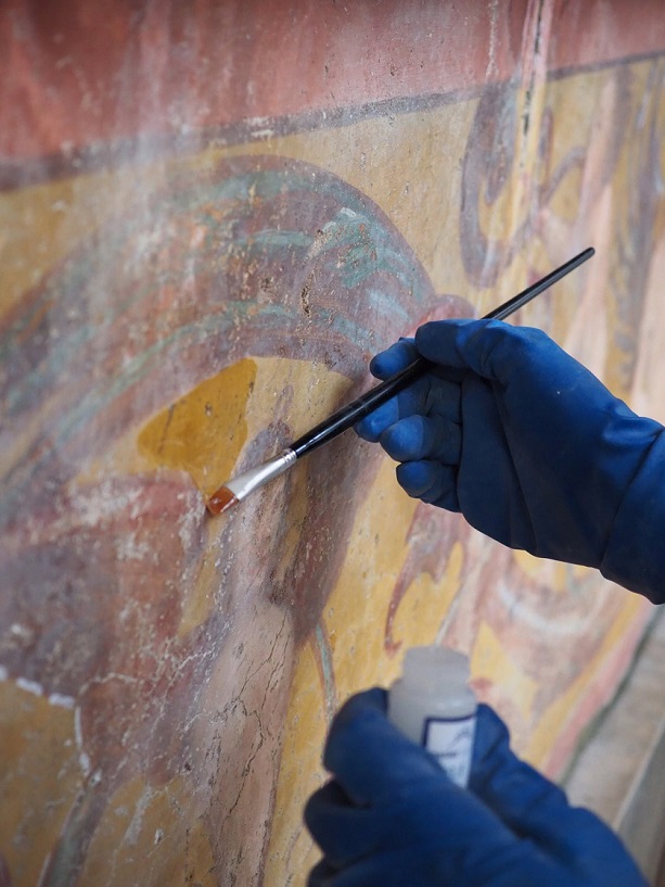 Gli obiettivi erano molteplici: in primo luogo consolidare le superfici pittoriche soggette a distacchi e sollevamenti, poi armonizzare l’aspetto complessivo della parete, minimizzando i segni lasciati da precedenti interventi – come vecchie stuccature e integrazioni – che rendevano l’immagine frammentaria.