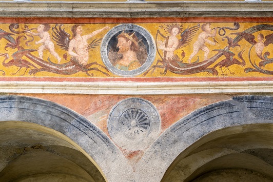 Sabato scorso, 22 luglio 2023, sono stati presentati gli esiti del restauro pilota sul prospetto est della corte d’onore. L’intervento eseguito ha riguardato sia la porzione di pitture murali sia gli elementi lapidei.