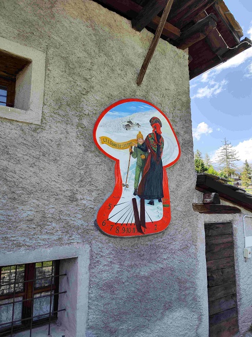 Sulla facciata del museo, in occasione delle Olimpiadi del 2006, l’associazione “Horologium” ha realizzato un grande quadrante solare, che è diventato una sorta di insegna del museo. La struttura principale del quadrante è sostituita dalla figura di una mamma, a dimensione naturale, vestita in un antico costume da festa. La figura femminile è affiancata da un ragazzo. Quest’ultimo ha ai piedi un paio di sci originali, che sono stati tagliati e che, opportunamente affiancati, creano una lama di luce la cui punta è lo gnomone dell’orologio. Le due figure, inserite in un paesaggio alpino, sono inscritte nella sagoma della “toque”, la caratteristica cuffia colorata della donna pragelatese, evidenziata in rosso, elemento visivo essenziale e “marchio” della comunicazione del museo.