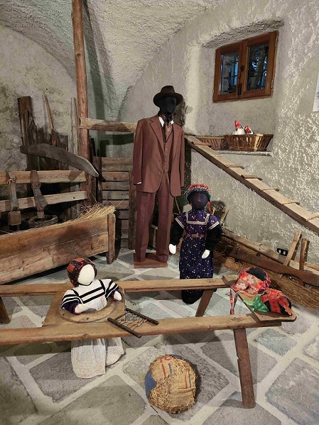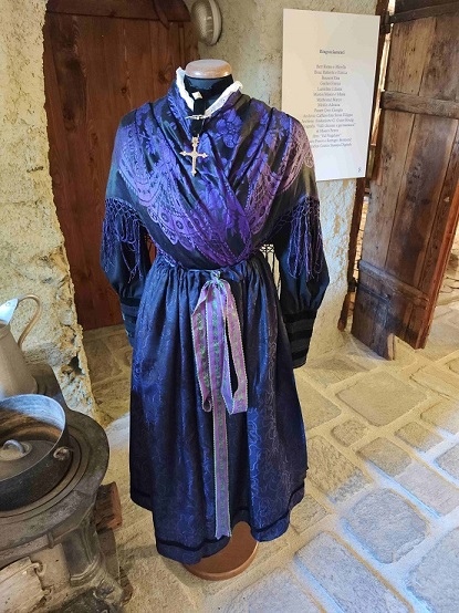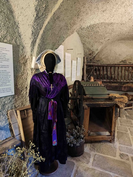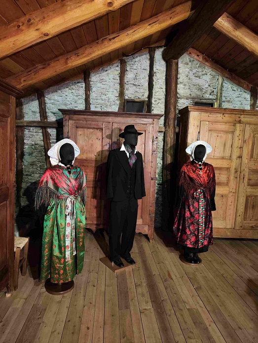 “Pezzo forte dell’allestimento museale, – come ci ha spiegato Marina Satta, una delle guide che accompagnano i visitatori, – è l’abito che le donne di Pragelato indossavano il giorno delle nozze e nelle cerimonie più importantidella vita religiosa e sociale. Il grembiule, lo scialle e il nastro sono in seta, importata da Lione. In capo le donne indossavano la cuffia detta barèt. Nei giorni di lavoro si indossava invece un costume più semplice, composto da un grembiule e da uno scialle in cotone”.