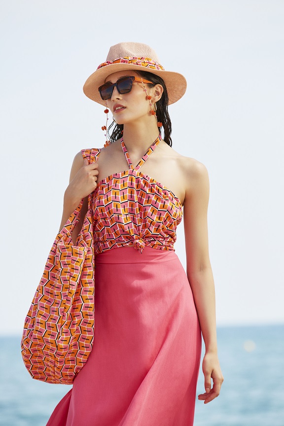 Il risultato è una proposta pensata per regalare un twist gioioso a giornate assolate in riva al mare: ci sono capienti bag e pochette di diverse misure; pratici teli da mare ripiegabili; leggeri caftani e parei arricchiti di nappe; cappelli e fasce per capelli.