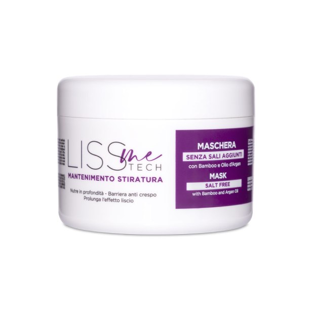 Maschera nutriente specifica per il mantenimento della stiratura LISS ME TECH. Senza sali aggiunti, solfati e parabeni, nutre in profondità e agisce sulla struttura del capello per ripristinare il naturale stato di salute. Prolunga l’effetto liscio della stiratura, lasciando i capelli morbidi, sani e setosi più a lungo. Gli estratti vegetali di Bamboo, Olio d’Argan, Riso e Aloe donano un’azione nutriente ristrutturante e condizionante, riducendo l’effetto crespo e rendendo i capelli immediatamente più lucidi, perfettamente lisci, setosi e facili da pettinare.