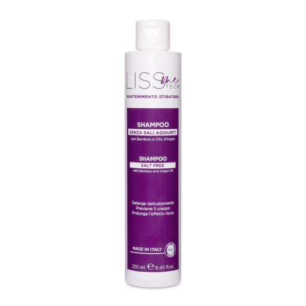 Shampoo specifico per il mantenimento della stiratura LISS ME TECH. Senza sali aggiunti, solfati e parabeni, deterge delicatamente i capelli nutrendoli in profondità. Prolunga l’effetto liscio dato dalla stiratura, lasciando i capelli morbidi, sani e setosi più a lungo. Grazie all’azione degli estratti vegetali di Bamboo, Olio di Argan, Riso e Aloe il capello risulterà nutrito e protetto. Previene l’effetto crespo.
