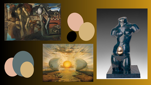 René Magritte, nell’opera “ La chiaroveggenza “, tramuta un uovo — il modello — in un uccello con le ali spiegate — il modello sulla tela — frutto di un’evoluzione immaginata e prevista dall’estro dell’artista, facendoci riflettere sul nostro modo di concepire la realtà, spesso troppo ottuso, e su cosa voglia dire osservare con sguardo attento. Uova sode, sciolte, integre, rotte, incrinate, all’occhio di bue… , insomma in tutte le salse, compaiono nelle opere di un altro grande surrealista, Salvador Dalì ; per lui l’uovo assume un’importanza tale da adornarne i tetti del suo studio a Port Lagat, paesino di pescatori sulla costa brava della Spagna, qui uova gigantesche si stagliano contro il cielo simili a sentinelle della sua mente sfrenata. Nella Metamorfosi di Narciso , del 1937, di forma ovale è la testa del mito greco cui si contrappone la mano che regge un uovo da cui spunta un fiore di narciso. Nel dipinto del ’48 “L’Aurora”, l’uovo è raffigurato con il rosso e vivo tuorlo, mentre l’albume diviene un fiume solcato in barca dall’essere del futuro. Nella Venus Spatiale , l’uovo poggia in equilibrio sopra il pube in una rappresentazione della fecondità senza tempo come allude la presenza di un orologio che ha perso la sua funzione primaria essendo liquefatto.