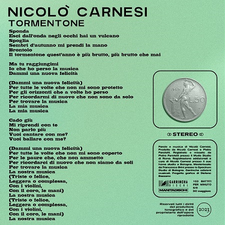 Con oltre dieci anni di carriera alle spalle, riconosciuto dal pubblico e dalla critica come uno dei talenti del nuovo cantautorato italiano grazie all’originalità della sua poetica e per la sua eleganza compositiva, dopo l’uscita di “Dinamite”, ballata esistenzialista dal gusto volutamente retrò che ha accompagnato il tour estivo del cantautore, Nicolò Carnesi torna con “Tormentone”, il secondo estratto che anticipa il suo nuovo album d’inediti di prossima uscita. Caratterizzato da brillanti giochi di parole e da sonorità vintage vicine ai motivetti degli anni ’60, “Tormentone” riconferma la natura nostalgica e autentica di Carnesi che con questo nuovo brano, nemesi dei “tormentoni estivi”, racconta la ricerca di qualcosa che crede perduto ma che non è realmente andato smarrito: la sua musica.