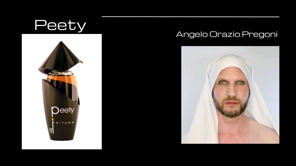 Se una nota azienda produceva un’acqua che faceva fare tanta Plin Plin, Pregoni crea un alcolico di lusso che necessita di 1 millimetro di pipì — 10 sole gocce —: Peety è una fragranza doc — si evolve tra note ambrate e tabaccose, sensazioni floreali di rosa e gelsomino, passando per la fava tonka, il sandalo e il pepe rosa, perbacco! — che scardina i leziosi cliché propinatici dai media, allontana dalla massificazione creativa, rappresenta una creazione veramente unica — come “nasomanufatto” artistico e come privilegio personale —. Peety è un jus snob, un prodigio ancestrale – la fava di tonka insomma e il pepe… — arricchito di alcune valenze pop e dada, oltre che di sensazioni nuove di metalli e frutti — la sensazione di metallo è da sbarrare gli occhi —.