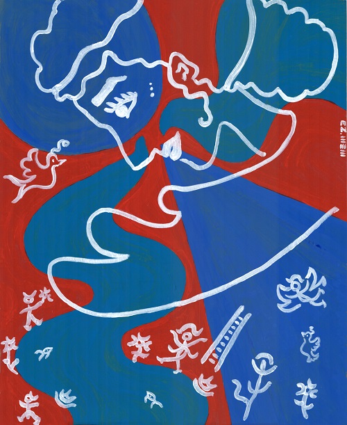 Protagonisti di una sezione espositiva sono i Coboldi e le Cobolde, personaggi stilizzati, buffi e indaffarati che abitano un universo riccamente simbolico e pieno di colore, in una sorta di spazio liminale tra il mondo conscio e quello onirico e fantastico, mentre in molte opere si possono riconoscere i Birdies, gli uccellini, firma stilistica dell’artista e messaggeri tra cielo e terra, tra realtà e immaginario.