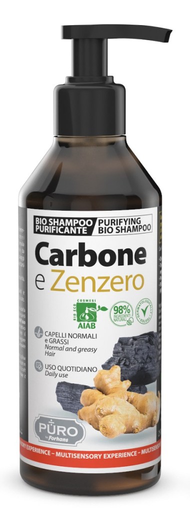 PURO Shampoo Bio al carbone e zenzero con la sua formula naturale è ideale per lavaggi frequenti e per i capelli grassi che tendono a sporcarsi presto. Il carbone vegetale aiuta a rimuovere le impurità, i residui di smog e il sebo in eccesso, mentre lo zenzero, dalle proprietà energizzanti e sebo-equilibranti, contribuisce a purificare la cute.