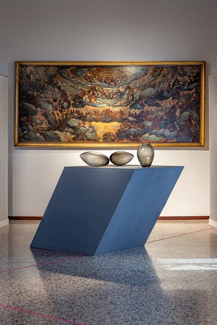 I tre lavori in vetro, già esposti sia a Venezia che a Londra, vengono riallestiti a Palazzo Contarini negli spazi della Fondazione Venezia Servizi, in dialogo con il magnifico bozzetto del Paradiso, uno dei capolavori del Maestro. L’opera finale, realizzata nel 1582 per la Sala del Maggior Consiglio a Palazzo Ducale, cuore politico e simbolico della Repubblica Serenissima, non venne dipinta direttamente da Jacopo Tintoretto che, ormai vecchio e stanco, affidò l’esecuzione alla sua bottega e al figlio Domenico, mentre è sua la realizzazione dei vari bozzetti preparatori.