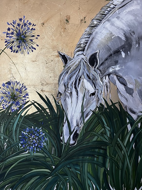 Con al suo attivo presenze al Louvre e al Moma, la senese Sara Caffarelli espone una sua tela che evoca la street art e i graffiti, Vittorio Fosi è presente con un collage di cavalieri ad acquerello; Iva Todorova, con un purosangue nero illuminato dalla foglia oro e anche io, che ho selezionato tutte le opere, espongo un mio quadro Agapanthus, un cavallo bianco che bruca fra i fiori.