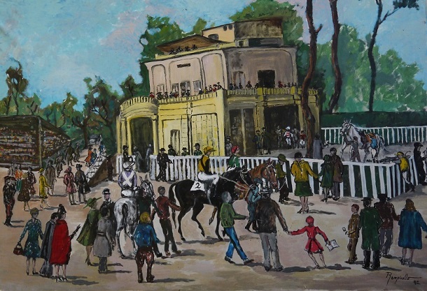 Fra gli artisti dell’edizione 2023 anche Rosanna Bonelli Flamini, conosciuta a Siena come Rompicollo, che espone una sua opera del 1962, “L’ippodromo delle Cascine” – olio su tela.