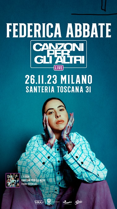 Federica Abbate annuncia “Canzoni Per Gli Altri Live” una speciale data evento, prodotta da Vivo Concerti, che avrà luogo il 26 novembre a Milano in Santeria Toscana 31. Al centro dello show ci sarà il mix originale di pop e urban proposto dalla cantautrice nel suo primo songwriter album. Disponibile per Carosello Records/Epic da venerdì 22 settembre su tutte le piattaforme digitali, “Canzoni per gli altri” è un viaggio in 9 tracce, realizzate in collaborazione con importanti artisti, ognuno dei quali ha lavorato insieme a Federica apportando la propria cifra stilistica. Per il pubblico sarà un’occasione unica per scoprire dal vivo la versatilità e il talento cantautorale di Federica Abbate.