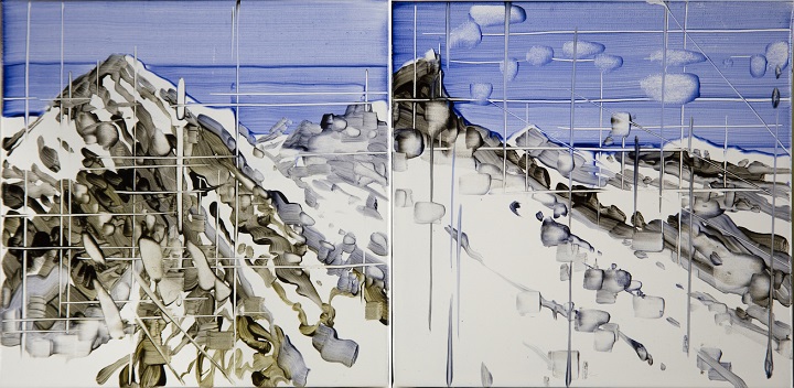 Rapa Nui e Siccità sono opere in cui, proprio come avviene negli omonimi film da cui traggono ispirazione, firmati rispettivamente da Kevin Reynolds e Paolo Virzì, la bellezza del paesaggio si accompagna ad una struggente poesia sulla dissoluzione della natura, su un mondo che precipita nel disordine, rovinato dall’uomo e dalla civiltà. Il documentario Chasing icedi Jeff Orlowski (2012) – sulla storia del fotografo James Balog, che documentò con i suoi scatti gli effetti del cambiamento climatico – dà vita ad un ciclo di dipinti emozionali dedicati al paesaggio, alle montagne e ai ghiacciai, con l’obiettivo di lanciare un grido d’allarme ed educare il grande pubblico alla necessità di salvaguardare le risorse naturali. I meravigliosi video di James Balog comprimono anni in secondi e catturano antiche montagne di ghiaccio in movimento, mentre scompaiono ad un ritmo impressionante: Giuseppe Linardi, grazie ai colori e alle forme, riesce a trasferire sulla tela identiche vibrazioni.