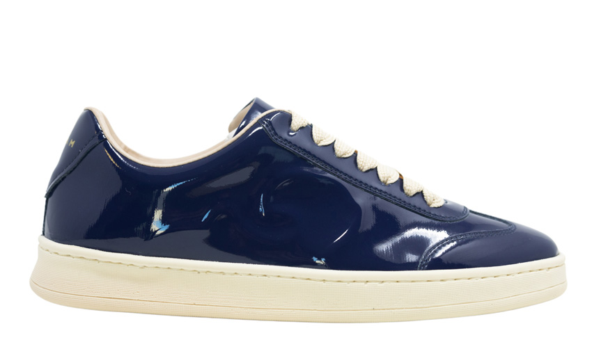 La tomaia della Acanto Logo Glossy è infatti in vernice bio-based nelle varianti nero, blu, offwhite e nude e la foglia di Acanto vi è riprodotta lateralmente con una tecnica in alta frequenza.