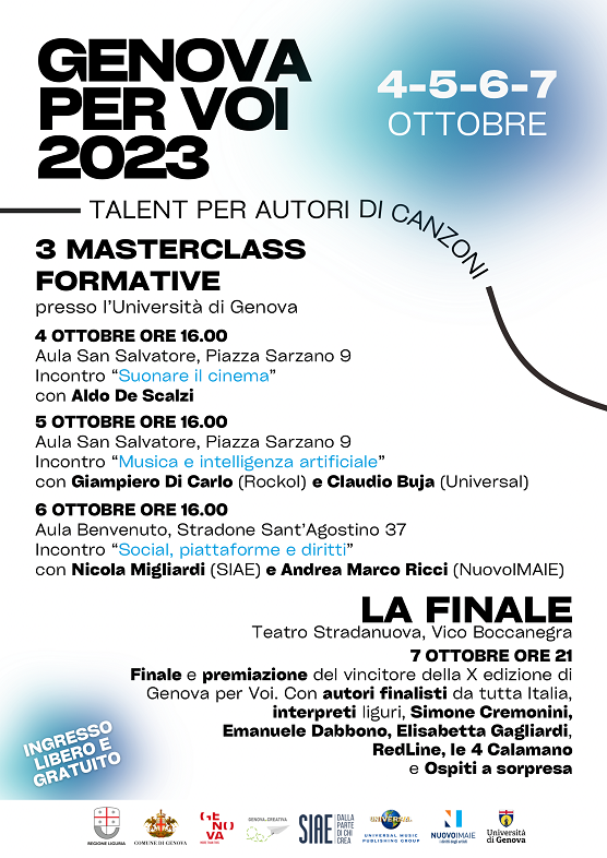 L’Università di Genova è la sede delle tre masterclass che permetteranno al pubblico di incontrare artisti, editori, giornalisti e dirigenti, tutti grandi protagonisti della musica italiana.