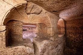 Il complesso catacombale di Ta’ Mitina è costituito da tre ipogei situati nella periferia meridionale di Mqabba. Questo complesso presenta caratteristiche uniche rispetto alle consuete strutture delle catacombe. L’ipogeo centrale è noto soprattutto per il suo triclinio estremamente ben conservato, un ambiente da pranzo scavato nella roccia utilizzato per i pasti commemorativi, e le due file di fori piramidali che lo fronteggiano. I due ipogei laterali sono invece noti soprattutto per la squisita decorazione di cui sono adornate alcune tombe a finestra.