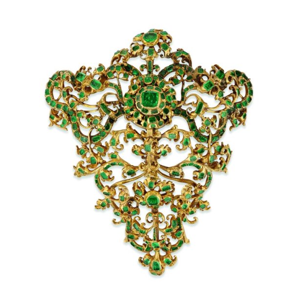 Tra i gioielli antichi spiccano due devant de corsage settecenteschi: uno realizzato in oro giallo e smeraldi (lotto 276), l’altro in oro giallo lavorato a sbalzo e ornato di diamanti taglio rosa (lotto 277) simile a quello conservato al Metropolitan di New York.