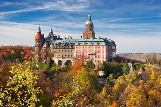 Il Castello Ksiąz è il terzo castello più grande della Polonia in Europa. Situato nella città di Walbrzych, nella Bassa Slesia, sud-ovest della Polonia, venne costruito nel XIII secolo e, nel corso dei secoli, subì molte modifiche e ristrutturazioni, in particolare durante il periodo barocco e neogotico. La sua imponente architettura affascina qualsiasi visitatore; il complesso è formato da diversi edifici e terrazzi, che si sviluppano su una superficie di circa trenta ettari e si trova all’interno dell’omonimo Parco Paesaggistico Ksiazanski. Il castello è un posto unico che testimonia il ricco patrimonio culturale del sud della Polonia e proprio per questo faceva gola ai briganti della zona che, una notte, decisero di irrompere ma furono talmente silenziosi che non svegliarono né le guardie né gli abitanti portando via sacchi pieni di oggetti preziosi. Quando ormai pensavano di averla fatta franca, passando accanto al mulino per tornare al loro nascondiglio, sentirono all’improvviso uno strano rumore. La diga sul torrente cedette e la rapida corrente trascinò via i ladri insieme ai sacchi pieni di ricchezze. Non sopravvisse nessuno dei briganti ma si racconta che i tesori del Castello Książ siano ancora nascosti sul fondale del torrente aspettando che qualcuno li scopra. Non è l’unica leggenda legata a questo maestoso edificio. Come in ogni castello che si rispetti, infatti, non mancano fantasmi che si aggirano tra le mura. Oltre al mistero, non mancano fiaba e magia: nella stagione invernale, infatti, il Parco Paesaggistico si trasforma in uno scintillante spettacolo di luci! Tra ottobre e febbraio, viene infatti allestita una mostra – il Giardino delle Luci – durante la quale è possibile ammirare decorazioni luminose che rendono ancora più bella la già straordinaria architettura del maniero. Dalle fontane zampillano gocce di luce, il Terrazzo delle Rose (Taras Rozany) è addobbato con fiori sfavillanti e il Terrazzo Occidentale (Taras Zachodni) si è trasformato in una fiabesca sala da ballo. Nel giardino incantato del Palmeto, tra il rumore dell’acqua e il canto degli uccelli, sarà possibile trovare splendide farfalle, fiori incantevoli e onde magiche piene di pesci colorati.