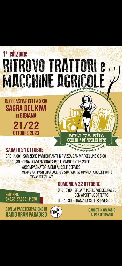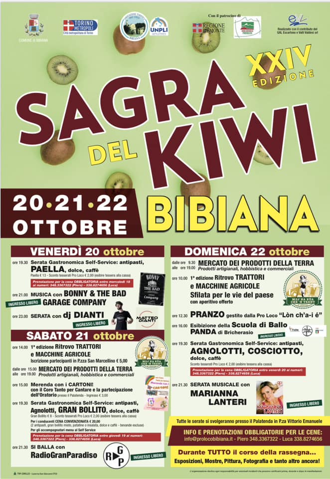 La ventiquattresima edizione della Sagra del Kiwi organizzata dalla Pro Loco di Bibiana e patrocinata dalla Città metropolitana di Torino si aprirà venerdì 20 ottobre e proporrà serate gastronomiche e musicali, mostre, mercati e tanto altro fino al 22 ottobre.
