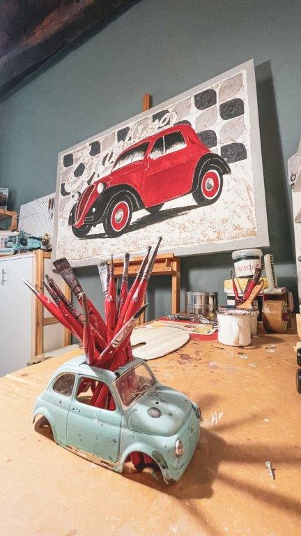 Non solo “bei ritratti di automobile” ma accattivanti e fedeli riproduzioni delle quattro ruote di ieri e di oggi, le opere in mostra sono realizzate su tela, montata dall’artista stesso, e dipinte ad olio o acrilico, con spatola e pennelli, in un rigoroso stile grafico che strizza l’occhio alla Pop Art, su uno sfondo materico spesso impreziosito da sabbia e polvere di quarzo.