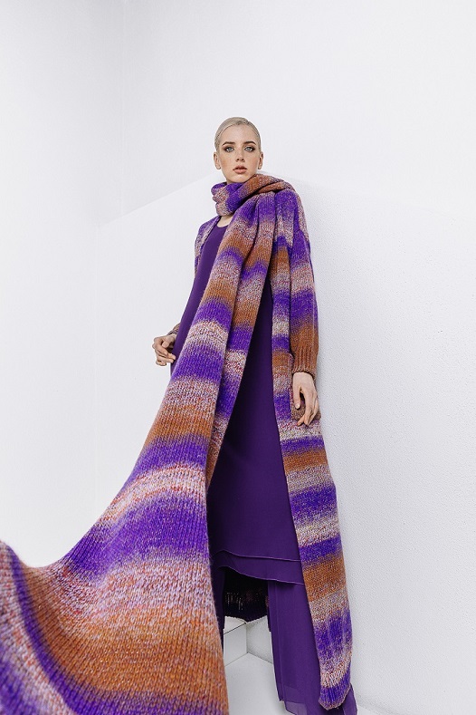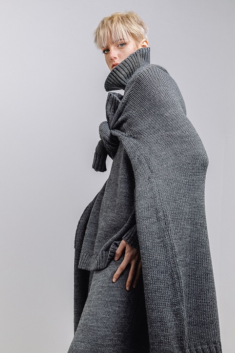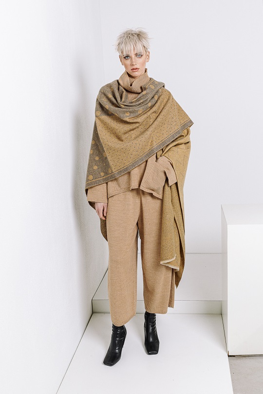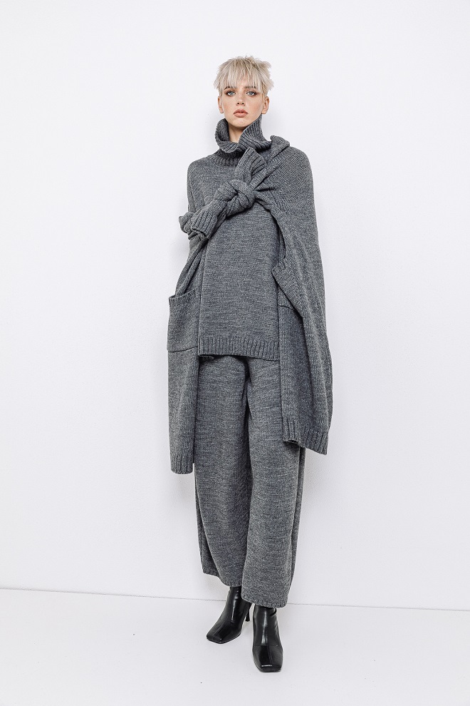 Knit passion anche per i morbidi e dritti pantaloni con elastico in vita e per il lungo lunghissimo abito tubolare con turtle neck che, come un prezioso bozzolo, protegge dal clima più rigido.