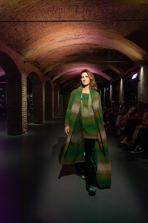 Qui un alternarsi di maglie, di giacche, di capispalla strutturati accompagnati da pantaloni e gonne morbide ha dato il ritmo a forme fluide e intrecci di filati, in un percorso suggestivo le cui tinte erano in dialogo con l’ambiente circostante.