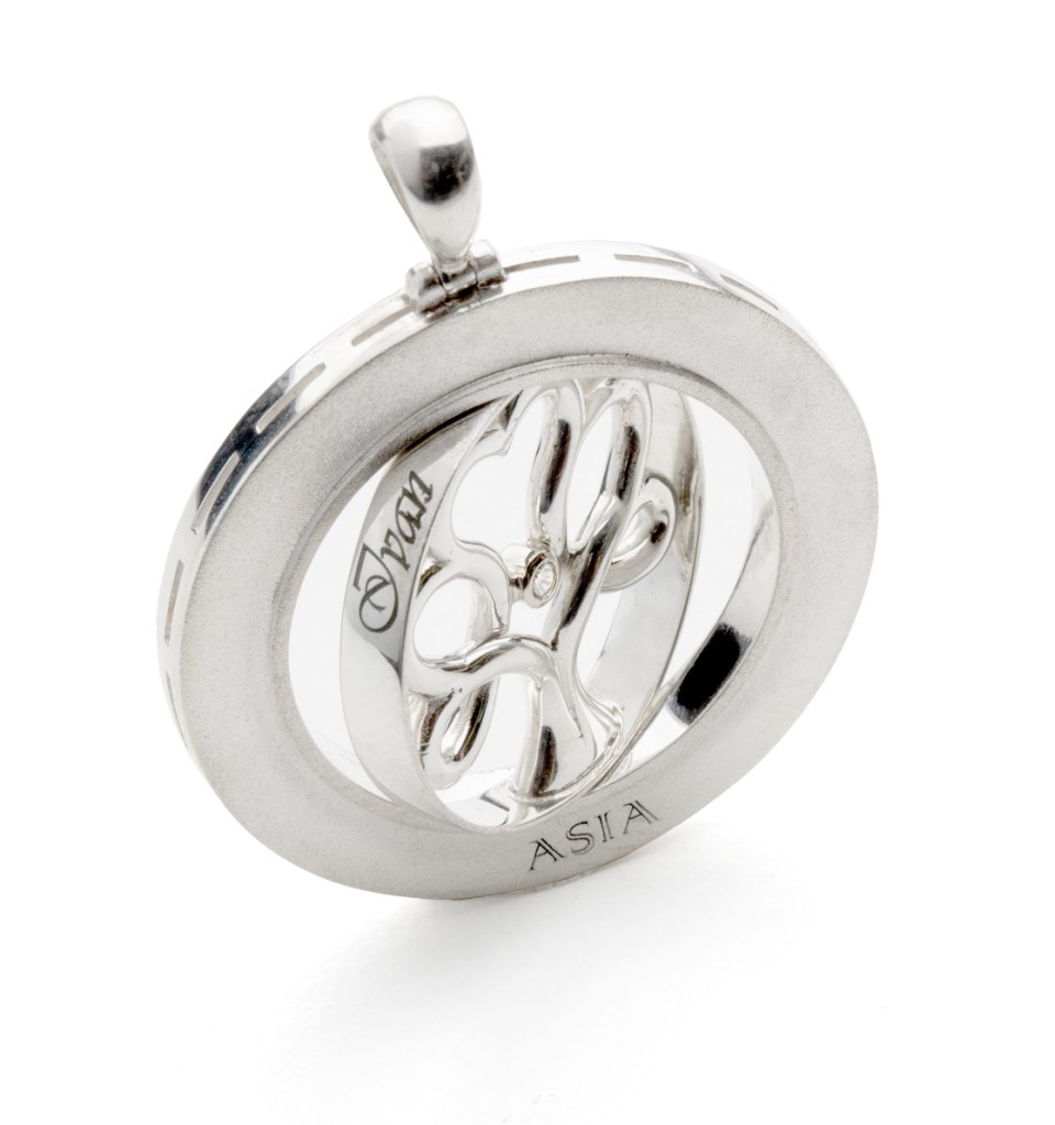 Il ciondolo Albero armillare del talentuoso designer orafo Ivan Barbato è arricchito da dettagli che ne permettono la personalizzazione, conferendo unicità al gioiello, così come è unica la vita di ogni persona. È possibile incidere all’ esterno il nome dei propri figli, ma la vera sorpresa è che la parte interna ruota su se stessa e svela l’incisione dei nomi dei genitori. Un gioiello giocoso e intimo, ideale per celebrare il legame famigliare o una donna della famiglia, la madre della vita… Il retro del gioiello è rifinito con un disegno su lastra, realizzato con tecnica del traforo. Ciondolo in oro bianco dimensione 33mm, caratura pietra centrale 0,04, prezzo € 2.650.