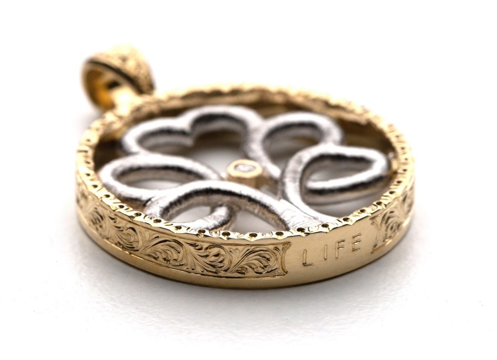 Adatto a chi predilige il gioiello contemporaneo con dettagli che ricordano l’arte orafa antica. Il pendente Vita dell’artigiano orafo Ivan Barbato in oro giallo 18 kt e argento 925 è caratterizzato da una delicata incisione realizzata a mano tramite il bulino, una tecnica che evoca i gioielli rinascimentali. Dimensione ciondolo 25mm, caratura diamante centrale 0,025 prezzo € 1.300