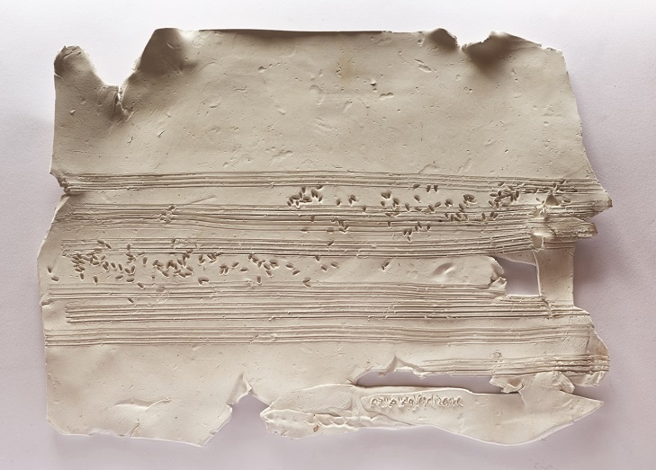 Completano la mostra tre “Spartiti” di terracotta che fanno parte dell’installazione Semi-ritmica, segnati in superficie da “note-seme” danzanti su immaginari pentagrammi, e cinque “opere su carta”, disposte lungo le pareti dello spazio espositivo e anche loro cosparse di semi o da impronte di semi: carte antiche o create manualmente con tecniche arcaiche dalla stessa artista, ulteriormente impreziosite da pigmenti naturali.