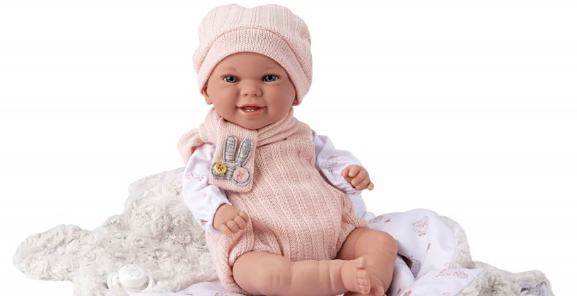 Un dono di Natale coinvolgente per un gioco all’insegna dell’empatia. Avvolta in una morbida copertina, indossa una salopette in tricot rosa con sciarpa e cappellino abbinati.