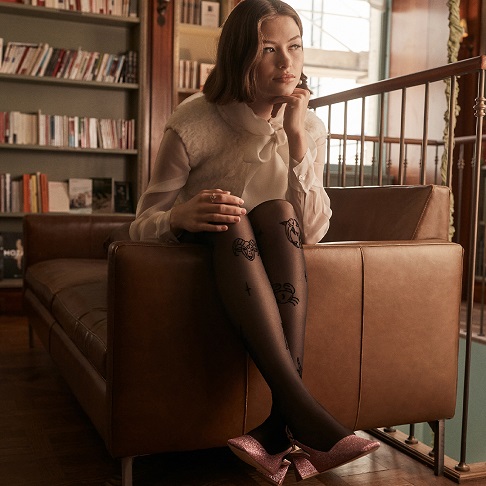 Stampe flock in oro e argento, disegni stilizzati e lettering, arricchiscono i classici collant velati donando ad ogni outfit uno stile pop e ricercato.