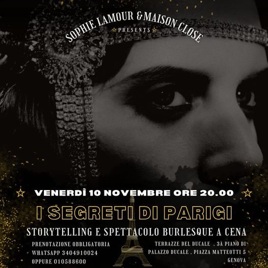 Venerdì 10 novembre 2023 alle ore 20.00 presso le Terrazze del Ducale a Genova, Sophie Lamour presenta “I segreti di Parigi” episodio speciale del ciclo Maison Close dedicato ai segreti della città dell’Amore.