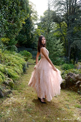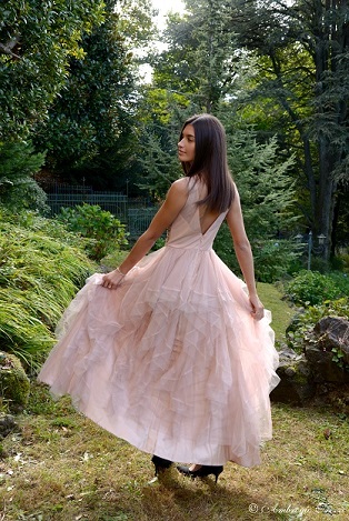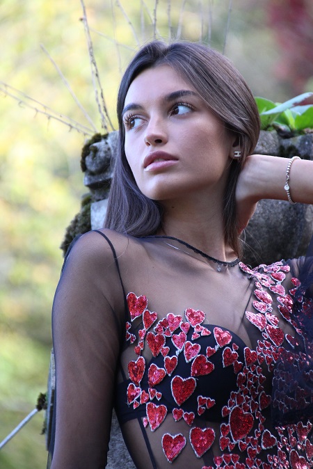 Un abito nero di tulle impreziosito con cuori di paillettes rosse, un abito rosa con dettagli in Swarovsky e una tutina color salmone con una gonna ampia in organza abbinata al medesimo.