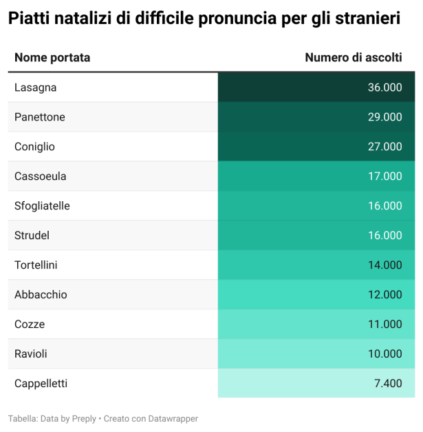 Preply ha quindi analizzato quali piatti della tradizione natalizia italiana possono risultare più difficili da pronunciare per chi parla un’altra lingua, tanto da richiedere più di un ascolto prima di essere assimilate correttamente. La lasagna, servita ovunque sulle tavole italiane ma in particolare in Abruzzo e nel Lazio, è il piatto delle festività più difficile da pronunciare per gli stranieri, con oltre 36.000 ascolti. Medaglia d’argento per il panettone (29.000); bronzo per il coniglio (27.000), che in Liguria viene preparato alla genovese, con olive nere taggiasche, vino locale, noci e pinoli.