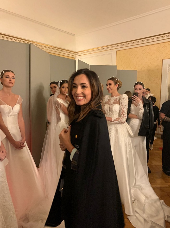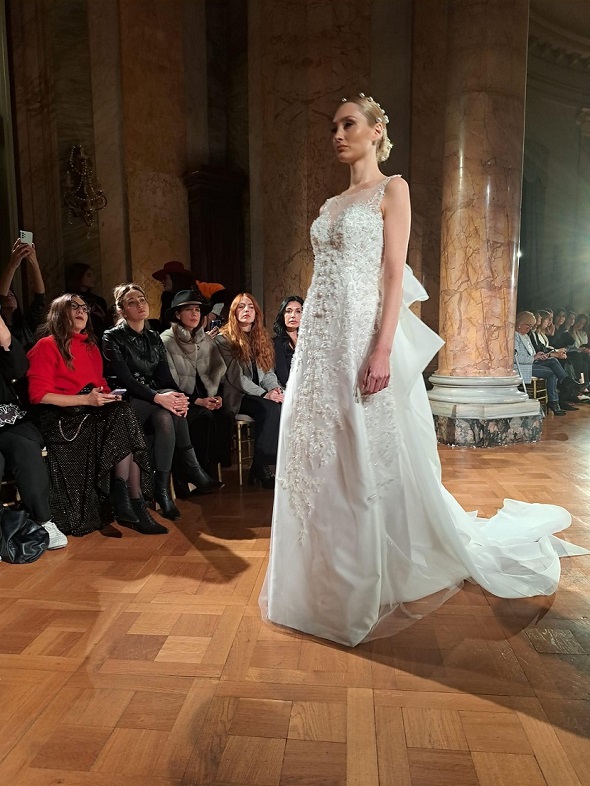 Oltre ai ricami, ai pizzi di chantilly francese, molti abiti sono decorati con intagli e trasparenze. Elena Parmegiani ha presentato l’evento.