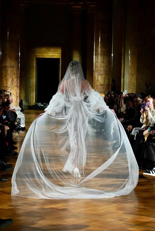 Lo stilista ha presentato la sua collezione alla Galleria del Cardinale Colonna. Cristalli, cannette e perle impreziosiscono gli scenografici abiti scultorei regalando alle spose una luce divina.