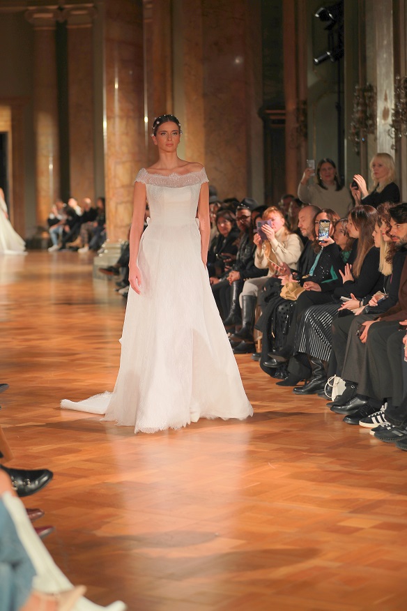 La collezione sposa 2024 di Gianni Molaro, presentata per l’occasione da Elena Parmegiani, Direttore Eventi della Galleria del Cardinale Colonna e Coffee House di Palazzo Colonna e giornalista di moda e costume, si caratterizza per i preziosi ricami a mano realizzati dalle petites mains locali.