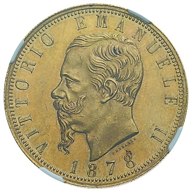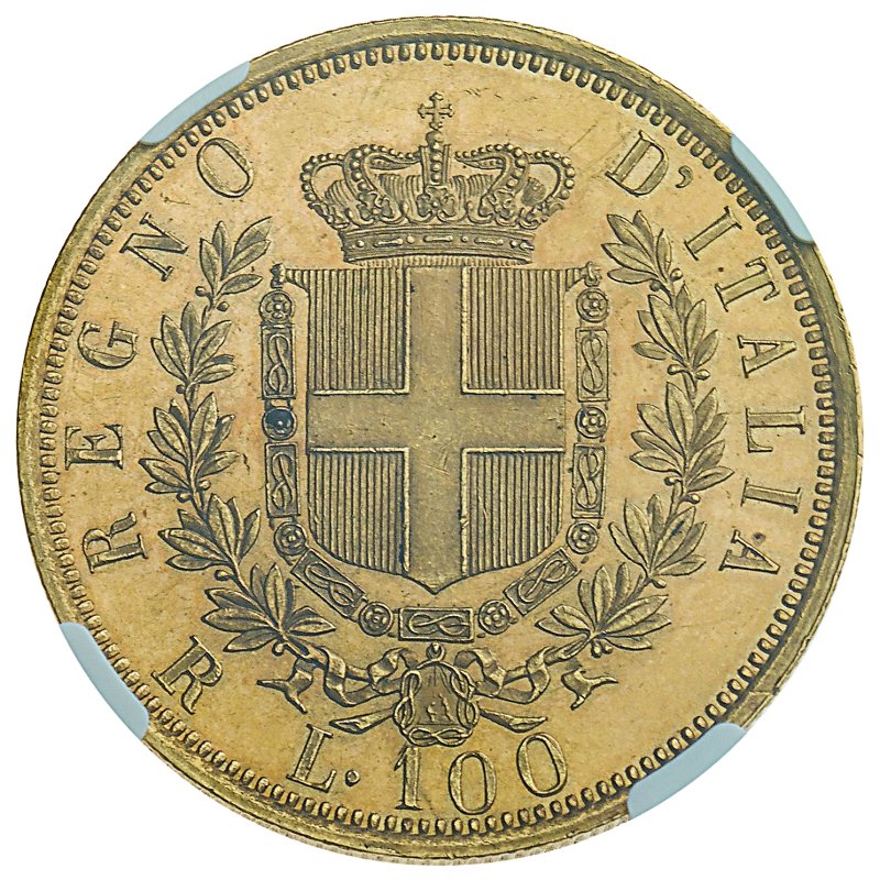 Sempre 100 lire, ma stavolta del Primo Re d’Italia Vittorio Emanuele II, per il lotto 1079. Coniate in oro in 294 esemplari nel 1878, ultimo anno di regno del re Galantuomo, sono estremamente rare e ottimamente conservate. Hanno una base d’asta di 30.000 Euro.