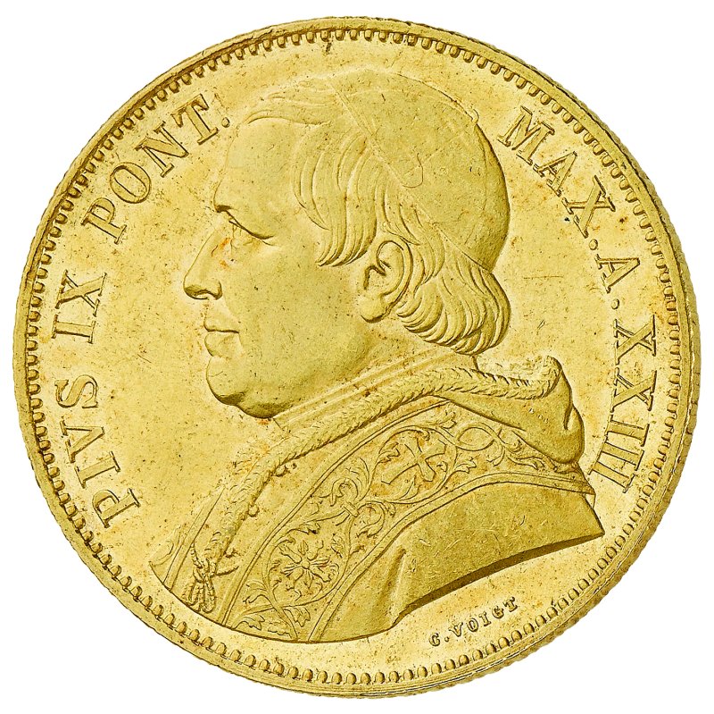Il lotto 933, datato 1868, è invece tra le ultime monete di Pio IX coniate dallo Stato Pontificio. Dopo la breccia di Porta Pia del 1870 la monetazione fu ripresa solo nel 1929 dalla Città Del Vaticano. Le 100 Lire all’asta da Bolaffi, in perfetto stato di conservazione, sono tra le più belle mai apparse sul mercato e vennero realizzate in soli 440 esemplari. Base d’asta: 10.000 Euro.