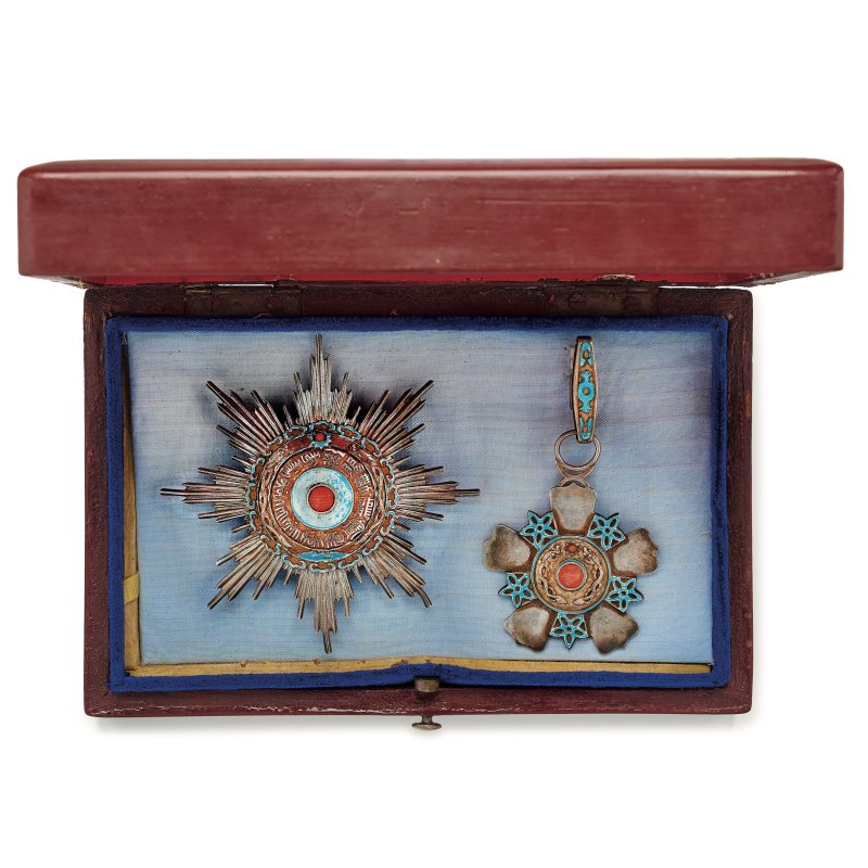 Tra questi si distingue il lotto 192, composto da un distintivo e una spilla in argento dell’Ordine del Doppio Dragone. L’Ordine venne fondato nel 1882 per ricompensare quegli stranieri che si fossero distinti a favore del trono e dello stato cinese ed esteso nel 1908 anche ai membri dell’Impero. La scelta del drago è importante perché notoriamente collegato alla famiglia imperiale cinese, oltre ad essere un tramite tra cielo e terra, portatore di pioggia e fertilità. Base d’asta di 3.000 Euro.