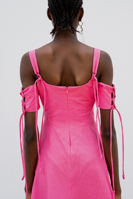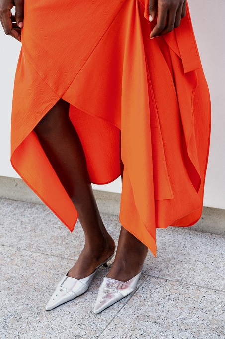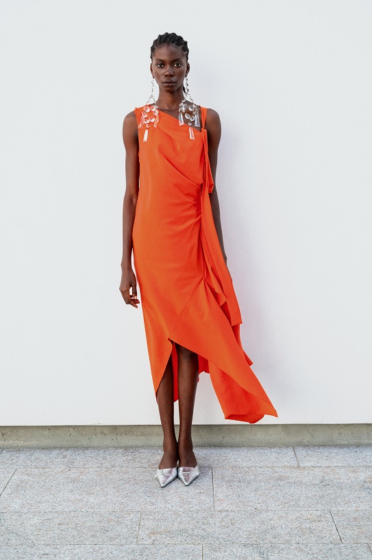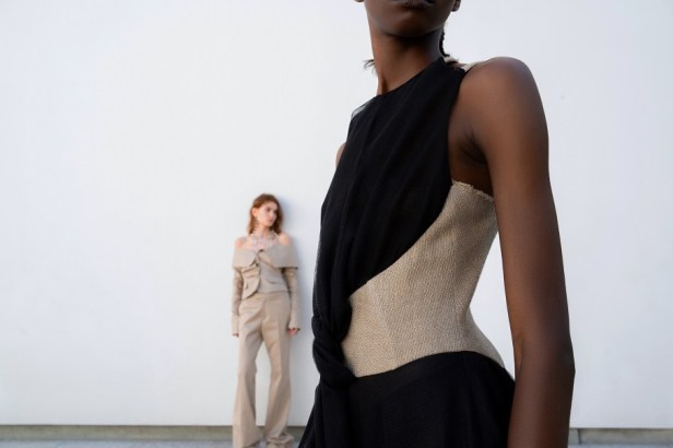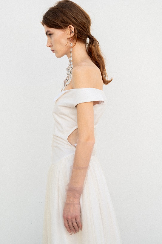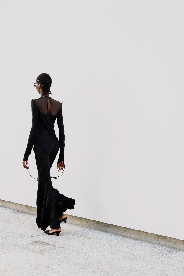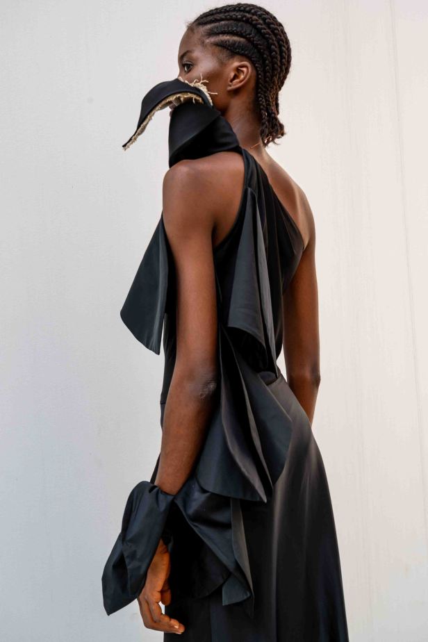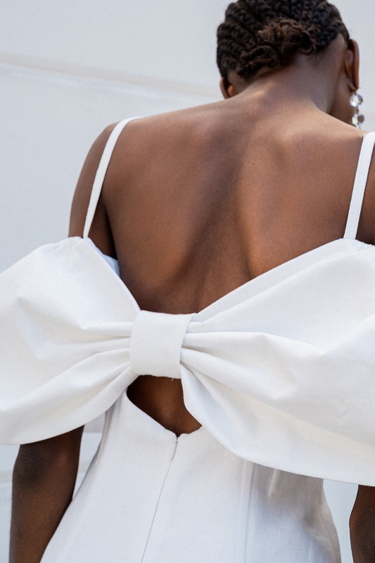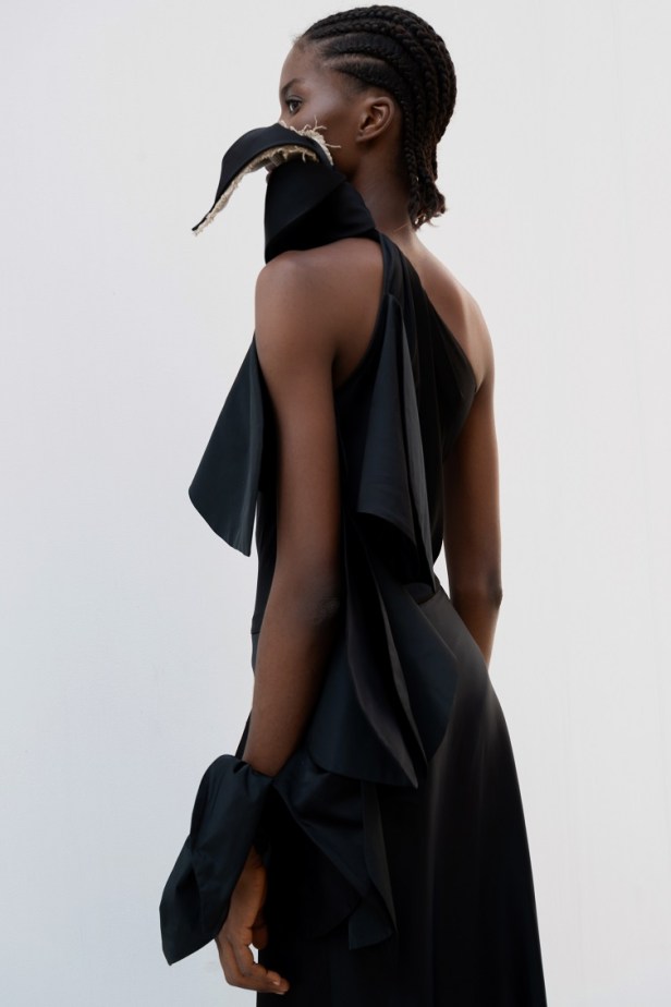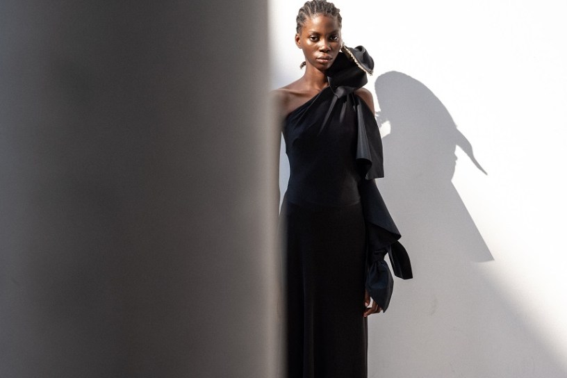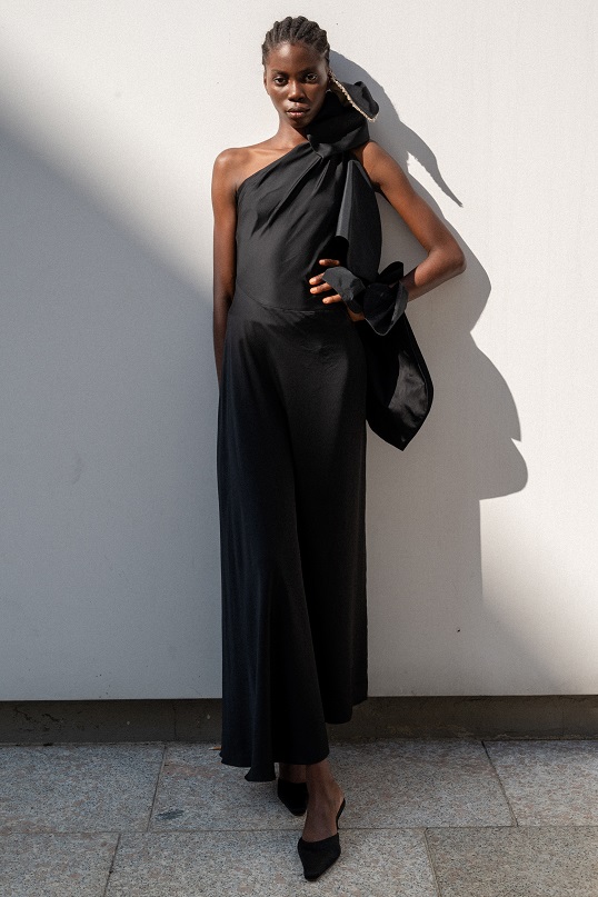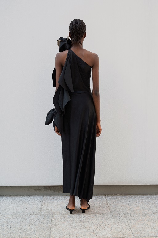I nodi di Romeo Gigli emergono come segni indelebili del DNA del marchio. Delicate spirali di seta si annodano sulle braccia e adornano scollature posteriori, evocando incantesimi magici e incarnando l’asimmetria dell’eleganza contemporanea.