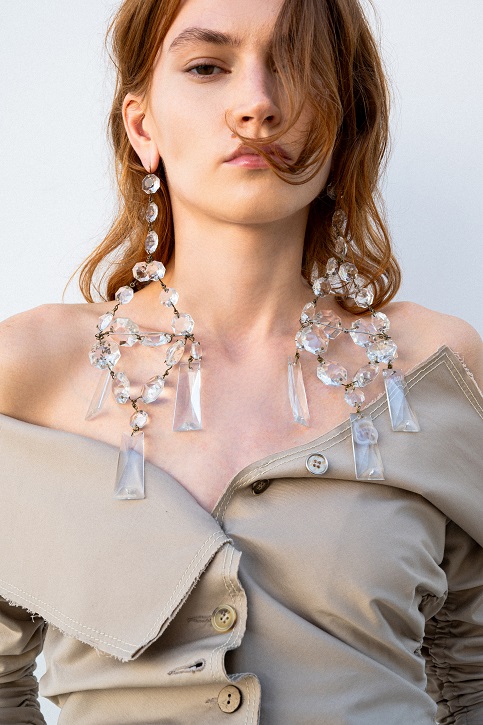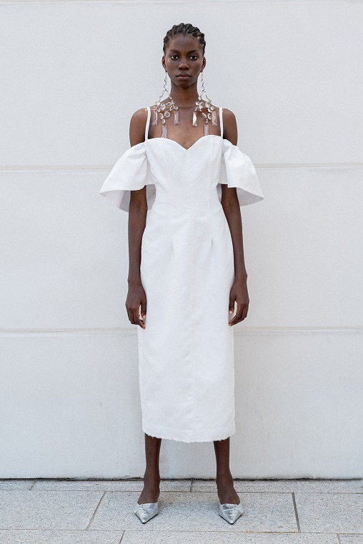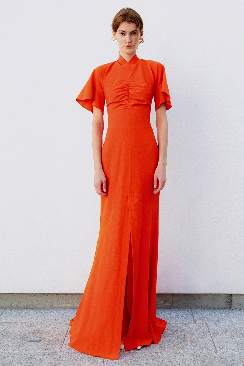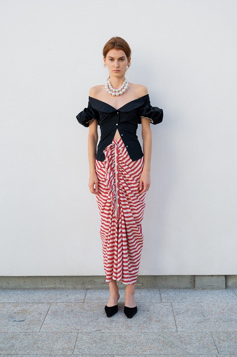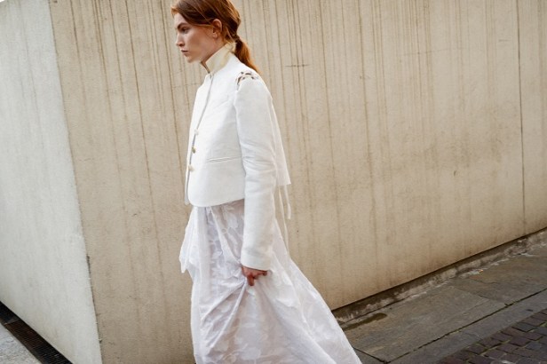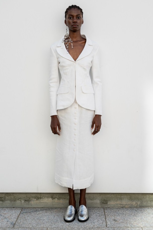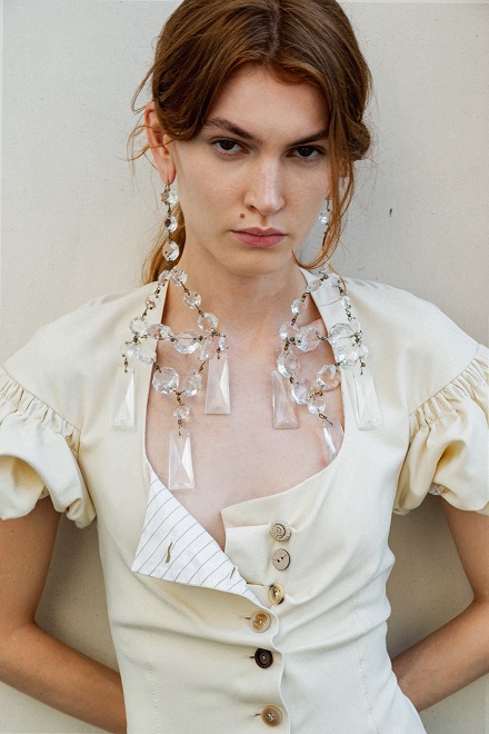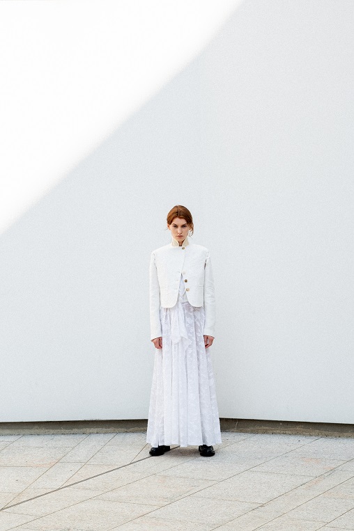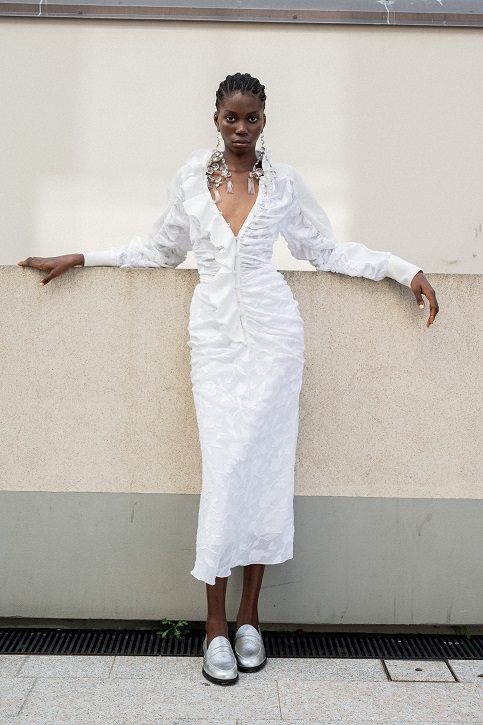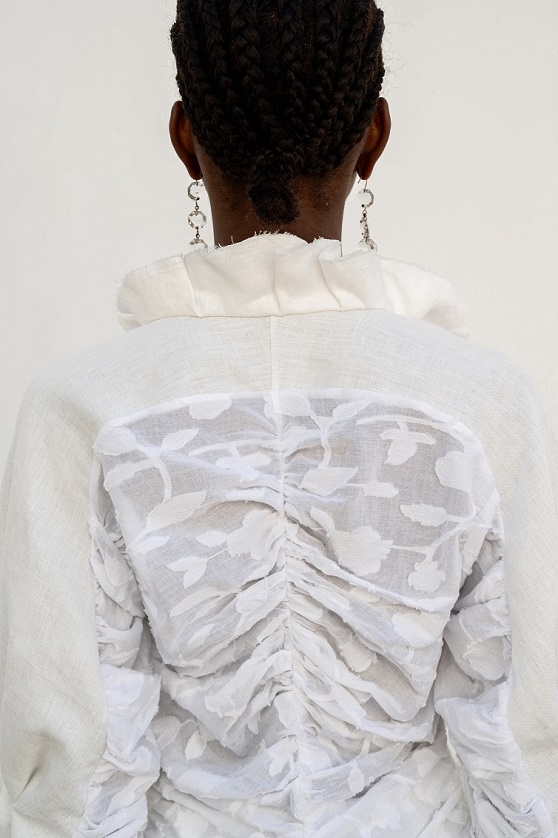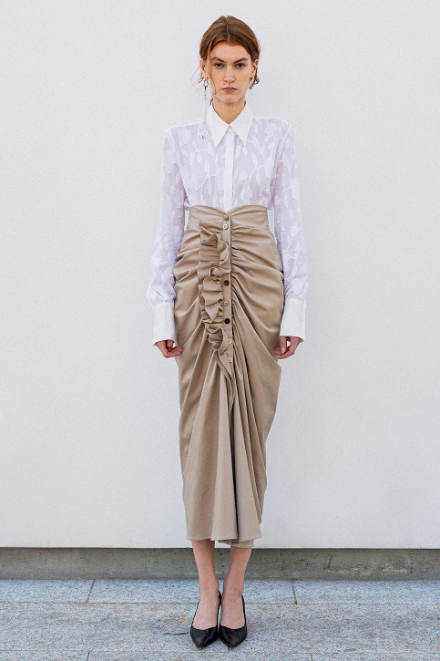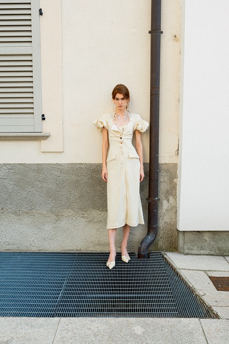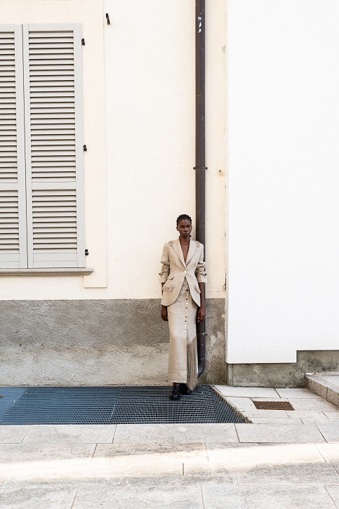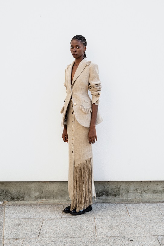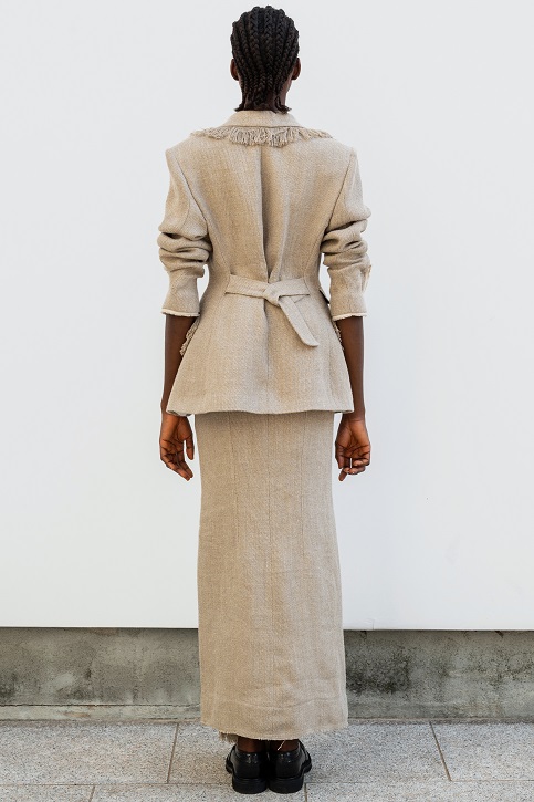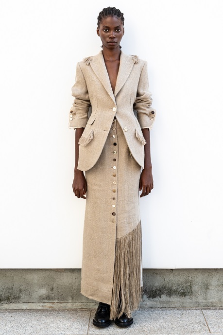 La juta, trasformata con sapienza in frange, dà vita a giacche e abiti lavorati con tecniche manuali pregiate che raccontano storie ancestrali. Il cavallery di cotone richiama le divise dei gendarmi dei primi anni del Novecento, creando gonne arricciate con rouches dal “taglio vivo” in una rigorosa forma cocoon, caratteristica del Gigli più romantico.