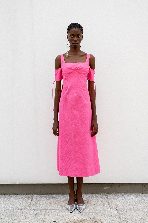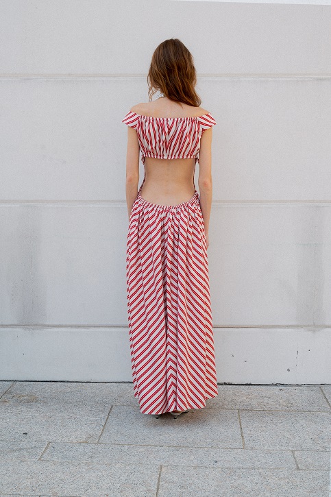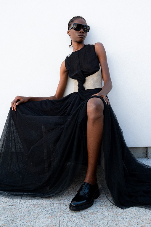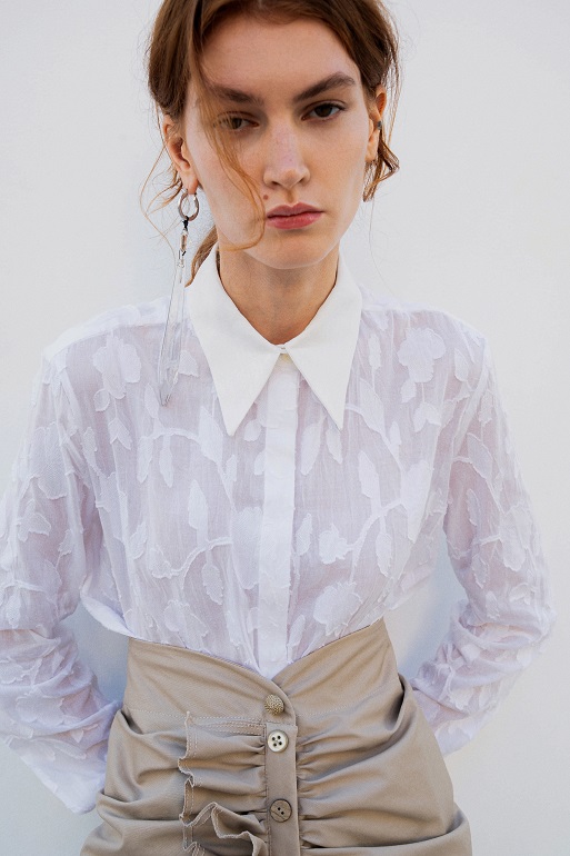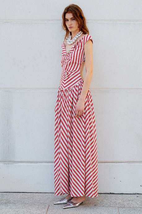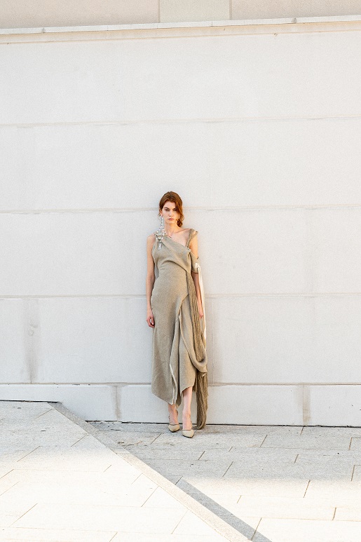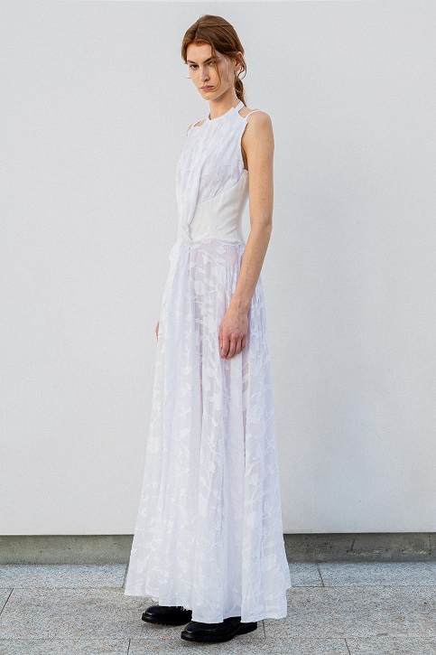 La seta increspata, lavata ed enzimata, si rivela fluttuante negli abiti serali, grazie a una meticolosa selezione di fili pregiati che conferiscono una lucentezza senza tempo. Il taffetà di seta sostiene nocche, petali avvolgenti e si unisce armoniosamente alla juta sfilacciata, creando onde di discrasia concettuale. Il fil coupè floreale in seta lino si adatta al corpo con drappeggi stropicciati che sembrano trasportare chi li indossa in un’altra epoca, rievocando algide eroine in crociere sul Nilo tra soleggiate dune esoteriche, alla ricerca di misteri irrisolti.