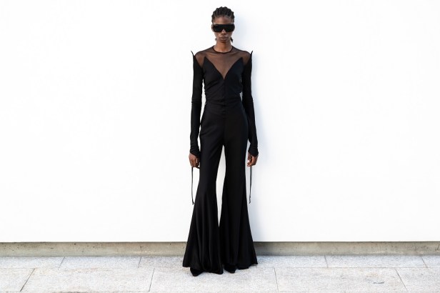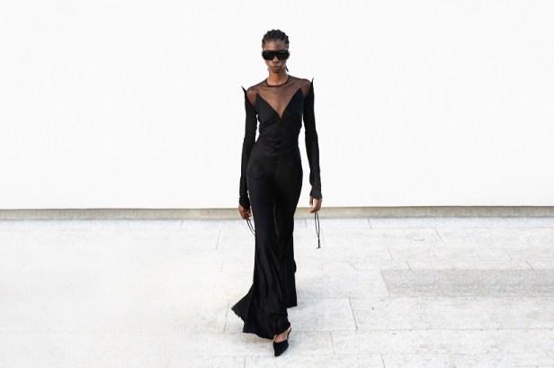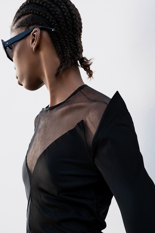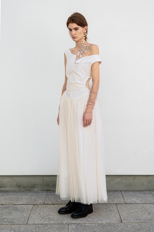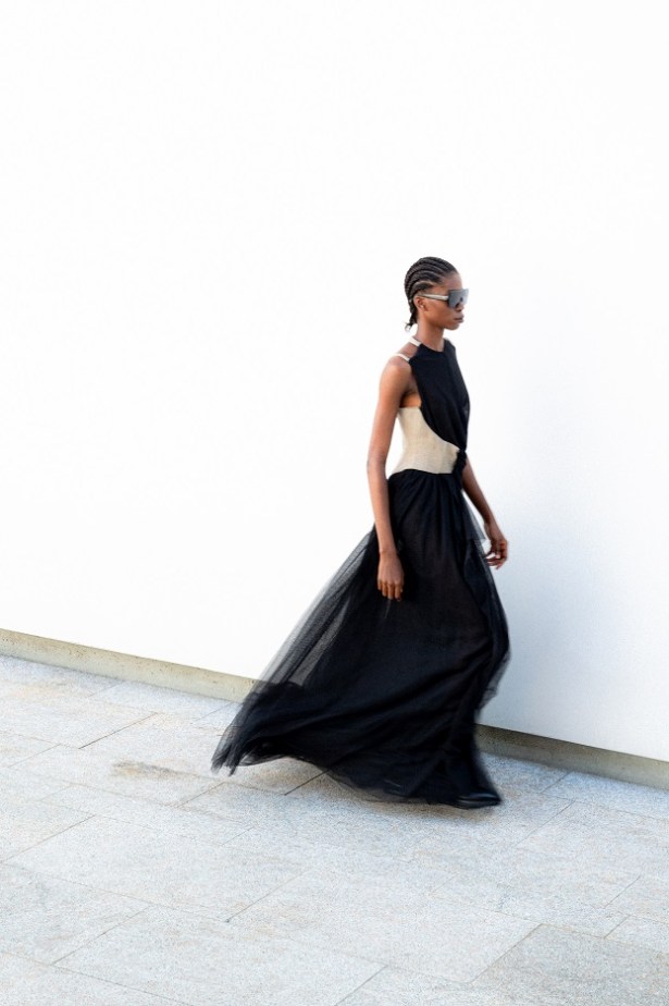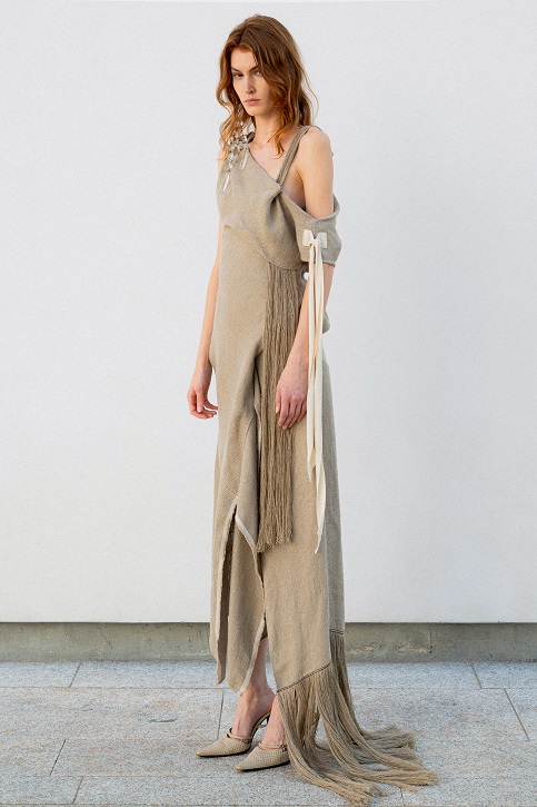 La particolare costruzione della giacca capovolta, un segno misterioso amato dal maestro negli anni ‘90, è reinterpretata come un bustino arricciato che mette in mostra le spalle. Gli abiti di juta e seta, modellati direttamente sui manichini attraverso riti druidici, si trasformano in frange surreali, tessute con fili pregiati che si intrecciano come incantesimi. Il tailleur in canapa con inserti piramidali tagliati si completa con la gonna lunga dai mille bottoni, evocando l’eleganza delle eroine delle crociere sul Nilo alla ricerca di misteri irrisolti.
